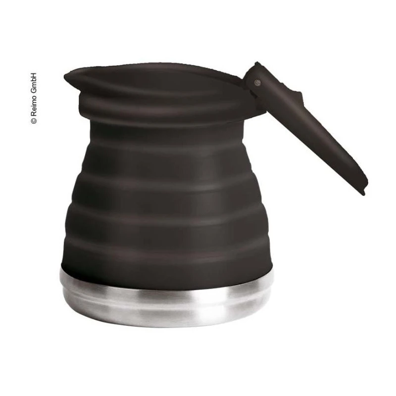 Bouilloire en silicone pliable 0,8 L de CAMP4 idéal pour faire chauffeur l’eau en bateau, camping-car ou au camping. Modèle Lotta noir avec couvercle.