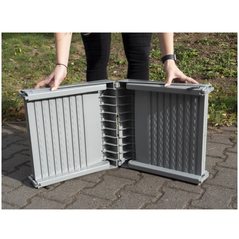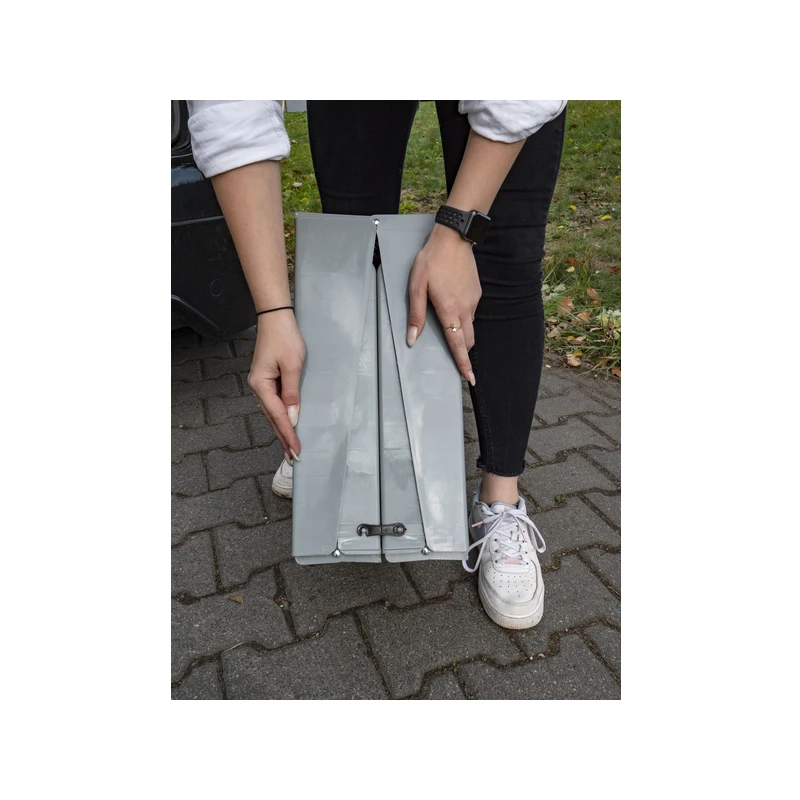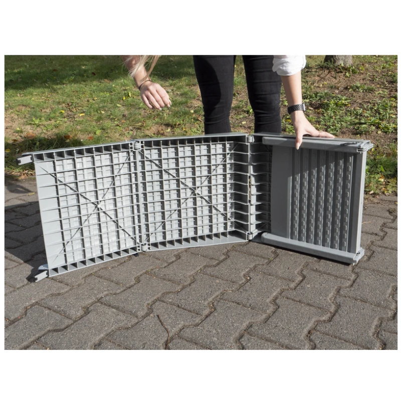La rampe se replie entièrement et se sécurise via un crochet l’empêchant de s’ouvrir. Les marches sont rainurées pour assurer une descente et une montée en toute sécurité sans risque de glissade.