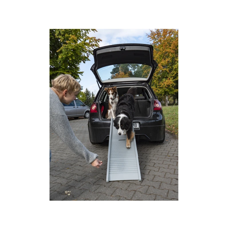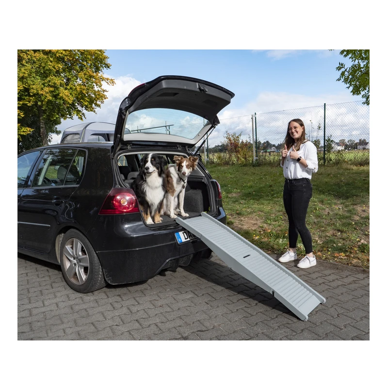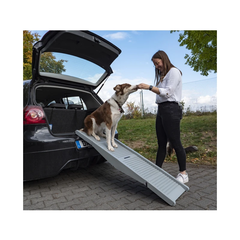 La rampe Emma de chez CAMP4 est un accessoire pliable et compact qui se dispose dans votre coffre ou dans votre hayon de van pour faciliter la descente de votre chien vers l’extérieur.