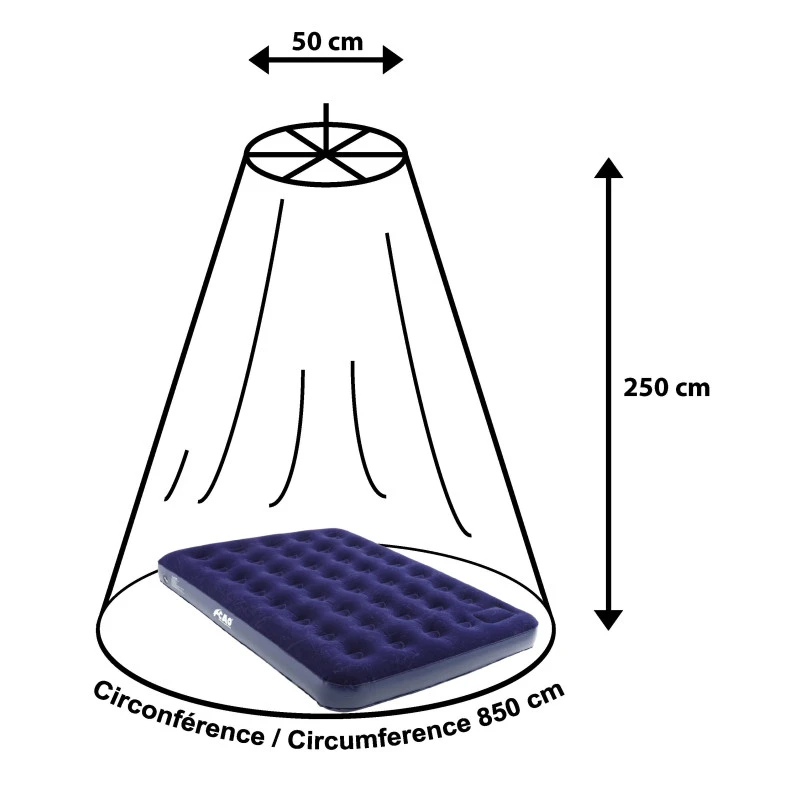 Parfait pour dormir à l’abris des nuisibles en intérieur sous la tente de camping ou en extérieur sur un lit de camp, cette moustiquaire CAO est très vite installée car elle se suspend en un point facilitant la mise en place. Avec sa circonférence maximale de 850 cm elle convient pour un matelas une ou deux places.