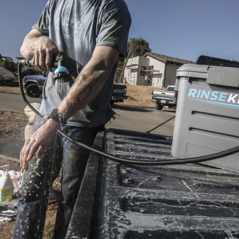 La douche portable autonome RINSEKIT Plus permet de dĂ©livrer un jet d’eau pressurisĂ© sans pompe ni batterie.